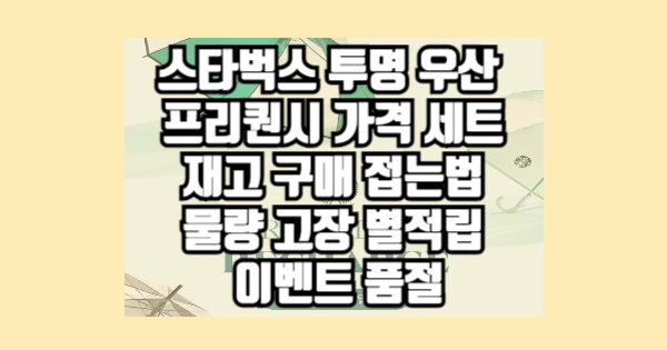 2025년에도 스타벅스는 여름철을 맞아 한정 수량의 투명 장우산 세트 이벤트를 진행합니다. 프리퀀시 별 적립, 가격, 구매 방법, 재고, 품절, 접는 법, 고장, 이벤트, 물량 등 궁금해하실 모든 정보를 한눈에 정리해드립니다.