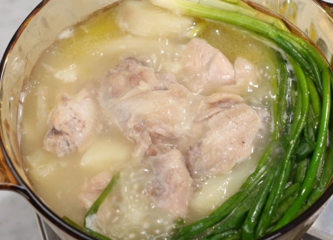 - 육수가 우러나면 감자와 대파를 넣고 15분 정도 더 끓입니다.