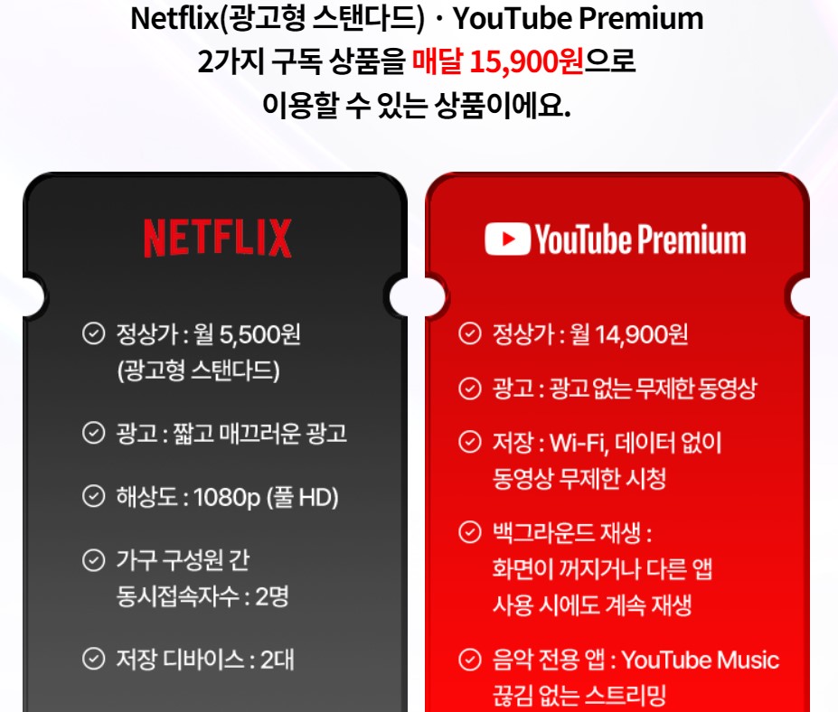 - 유튜브 프리미엄과 넷플릭스 광고형 스탠다드를 한 번에 구독할 수 있습니다.