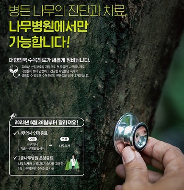 수목진료는 나무의사가 있는 나무병원을 통해서만 가능합니다. 이는 농작물을 제외한 모든 나무를 대상으로 하며, 본인 소유의 수목을 직접 진료하는 경우나 국가 또는 지방자치단체가 실행하는 산림병해충 방제사업의 경우는 예외입니다. 기존 나무병원 등록자는 2023년까지 자격을 취득해야 합니다.