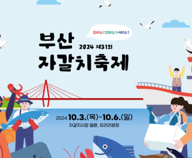 부산자갈치축제가 10월 3일부터 6일까지 자갈치시장과 유라리광장 일대에서 펼쳐집니다. 입장료는 무료입니다.
