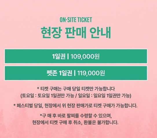 현장에서 신용카드 결제만 가능하며, 티켓 구매 후 취소 및 환불은 불가합니다. 현장 구매 시 지류 티켓 없이 바로 팔찌티켓으로 수령하실 수 있습니다.