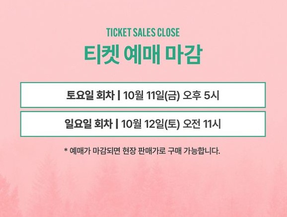 현재 티켓이 소량 남아 있으니, 구매를 원하시는 분들은 서둘러 주세요! 예매 마감 후에는 공연 당일 티켓 부스에서 현장 판매가로 구매하실 수 있습니다.