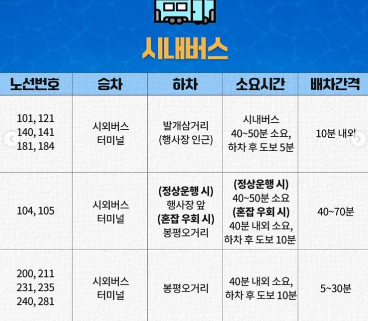 - 시내버스: 101, 121, 140, 141, 181, 184, 104, 105, 200, 211, 231, 235, 240, 281번 버스 이용