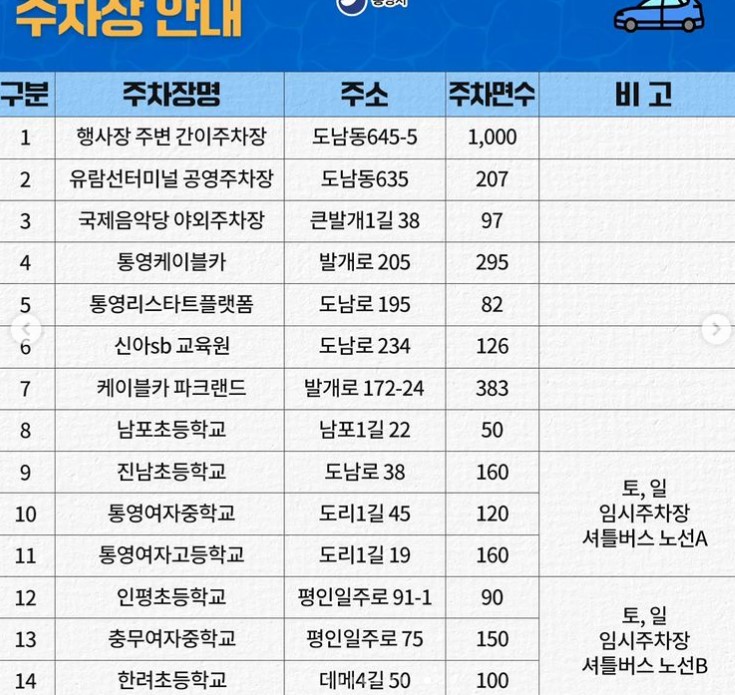 - 임시주차장: 통영여중, 통영여고, 진남초교, 남포초교 등 14곳