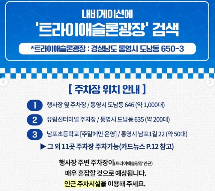 - 자가용: 내비게이션에 ‘트라이애슬론광장’ 검색 (경상남도 통영시 도남동 650-3)