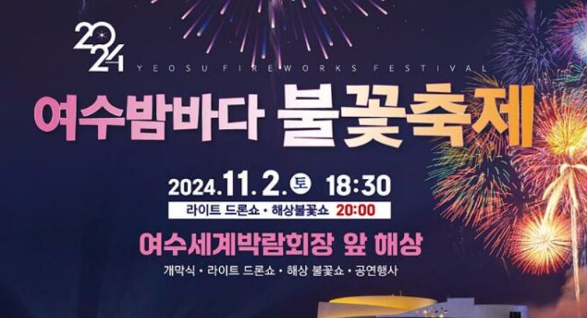 여수의 대표 축제인 '2024 여수밤바다불꽃축제’가 11월 2일 여수세계박람회장 앞 해상에서 열립니다. 이번 축제는 '불꽃, 바다에서 미래와 만나다’라는 주제로 진행되며, 다양한 프로그램과 볼거리가 준비되어 있습니다.
