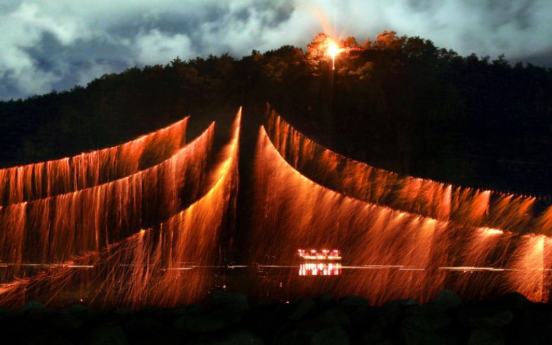 '낙화’는 말린 솔가지 묶음에 불을 붙여 부용대 벼랑 아래로 떨어뜨리는 장면입니다. 불꽃이 폭포처럼 떨어지며, 그 장관은 보는 이들의 탄성을 자아냅니다. 이 장면은 하회선유줄불놀이의 백미로 꼽히며, 많은 사람들이 이 순간을 기다립니다.
