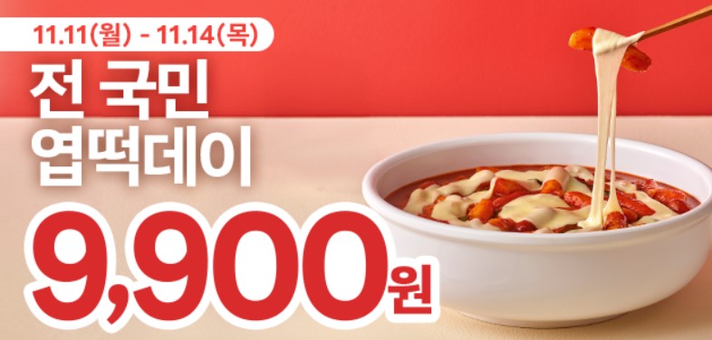- 엽떡앱 회원 누구나, 엽기메뉴(떡볶이/오뎅/반반) 9,900원 (선착순 11만 명, 결제 기준으로 카운팅)