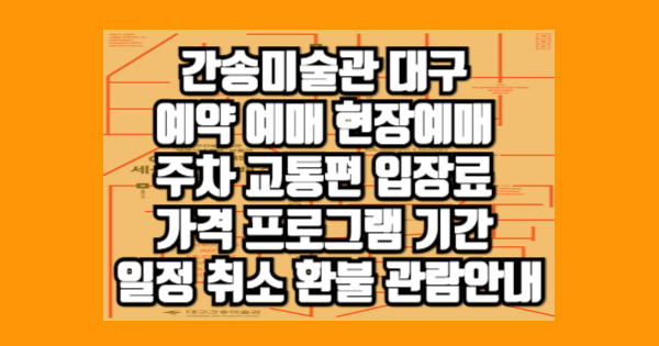 간송미술관 대구 예약 예매 현장예매 주차 교통편 입장료 가격 프로그램 기간 일정 취소 환불 관람안내에 대하여 소개해보도록 하겠습니다. 이 문서를 끝까지 읽어주신 분들은 간송미술관 대구 예약 예매 현장예매 주차 교통편 입장료 가격 프로그램 기간 일정 취소 환불 관람안내를 이해하게 될 것입니다. 간송미술관 대구 예약 예매 현장예매 주차 교통편 입장료 가격 프로그램 기간 일정 취소 환불 관람안내가 궁금하신 분들은 모두 읽어주시면 도움이 되실 것입니다. 이제 간송미술관 대구 예약 예매 현장예매 주차 교통편 입장료 가격 프로그램 기간 일정 취소 환불 관람안내를 알아보도록 하겠습니다.