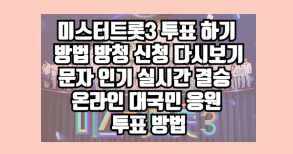 미스터트롯3 투표 하기 방법 방청 신청 다시보기 문자 인기 실시간 결승 온라인 대국민 응원 투표 방법에 대해 알아보겠습니다. 이 문서를 읽어주시면 미스터트롯3 투표 하기 방법 방청 신청 다시보기 문자 인기 실시간 결승 온라인 대국민 응원 투표 방법을 알게 되실 겁니다. 미스터트롯3 투표 하기 방법 방청 신청 다시보기 문자 인기 실시간 결승 온라인 대국민 응원 투표 방법의 정보가 필요하신 분들은 모두 읽어주세요. 아래에서 모두 공유해드리겠습니다.
