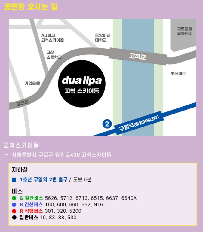 두아 리파는 4일과 5일 오후 8시 서울 구로구 고척스카이돔에서 'Radical Optimism Tour in Seoul' 콘서트를 진행할 예정입니다. 이번 콘서트는 월드투어의 일환이며, 2018년 5월 첫 단독 내한 공연 이후 6년 만에 이루어지는 내한 공연입니다.