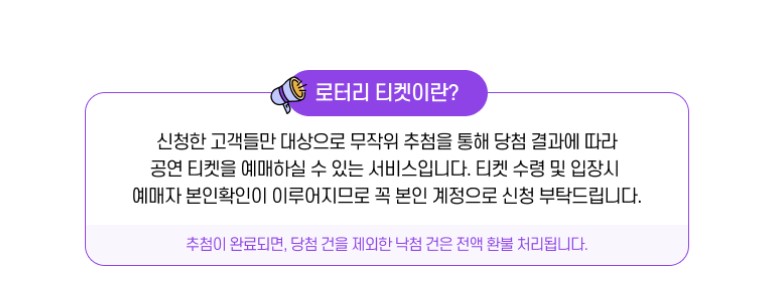 로터리티켓의 결제는 관람 확정이 아니며, 안내된 일정에 따라 최종당첨이 되어야 공연 관람이 가능합니다.