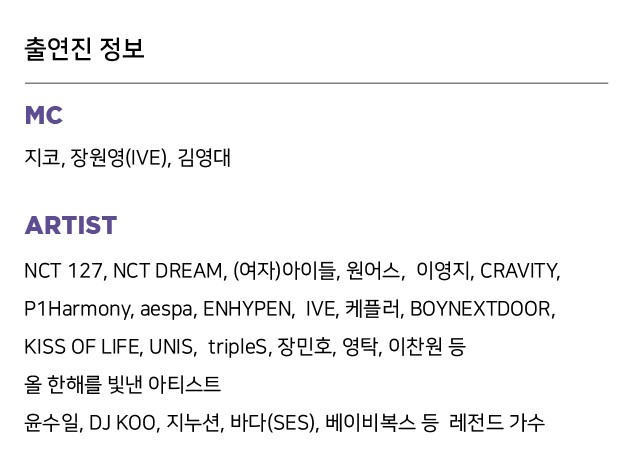 올해의 축제는 정말 다양한 세대와 장르의 아티스트들이 한자리에 모입니다. 2024년을 빛낸 스타들부터 추억의 레전드 가수들까지, 전 세대 음악팬들의 마음을 사로잡을 것 같아요.