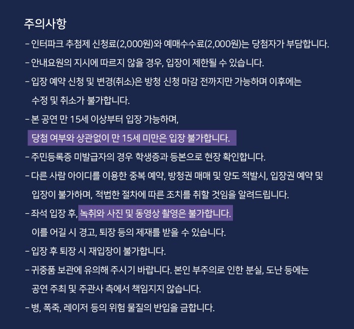 반드시 관람하실 분 본인 계정으로 로터리 신청 및 결제해주셔야 합니다. (대리수령, 대리관람 절대 불가)