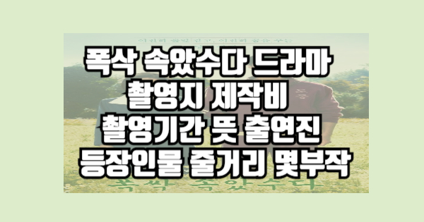 폭삭 속았수다 드라마 촬영지 제작비 촬영기간 뜻 출연진 등장인물 줄거리 몇부작에 대하여 소개하겠습니다. 이 포스트를 읽고 나면 폭삭 속았수다 드라마 촬영지 제작비 촬영기간 뜻 출연진 등장인물 줄거리 몇부작을 이해하시게 될 것입니다. 폭삭 속았수다 드라마 촬영지 제작비 촬영기간 뜻 출연진 등장인물 줄거리 몇부작이 궁금하신 분들은 모두 읽어주시면 도움이 될 것 같습니다. 이제 아래에서 설명해드리겠습니다.