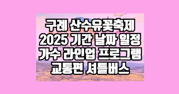 구례 산수유꽃축제 2025 기간 날짜 일정 가수 라인업 프로그램 교통편 셔틀버스를 탐구하겠습니다. 이 글을 모두 읽어주시면 구례 산수유꽃축제 2025 기간 날짜 일정 가수 라인업 프로그램 교통편 셔틀버스를 알게 될 것이라고 기대하고 있습니다. 구례 산수유꽃축제 2025 기간 날짜 일정 가수 라인업 프로그램 교통편 셔틀버스가 궁금하시다면 반드시 모두 읽어주세요. 아래에서 모두 공유해드리겠습니다.