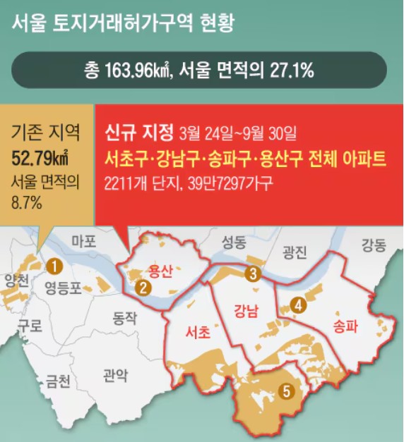 최근 서울 집값 상승세가 금리 인하와 맞물려 심각하게 확산할 수 있다는 우려가 컸습니다. 특히, 지난달 13일 토지거래허가구역에서 해제된 송파구 잠실동, 강남구 삼성·대치·청담동이 재지정되면서, 강남 3구와 용산구 내 아파트 2211개 단지, 약 40만 가구가 규제로 묶이게 되었습니다. 이는 서울 내 토지거래허가구역 면적을 52.79㎢에서 163.96㎢로 3배로 늘리는 결과를 가져왔습니다.