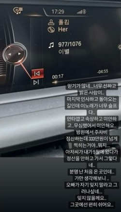 박하나는 18일 자신의 인스타그램 스토리에 "믿을 수 없다. 너무 착하고 밝은 사람은 "마지막 이별을 마치고 돌아오는 길인데 이 노래가 너무 슬프다"며 차 안에서 '굿바이'를 듣고 있는 가수 폴 킴의 사진을 올렸습니다.