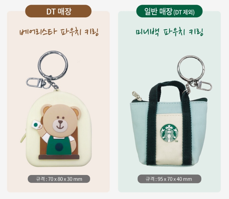 스타벅스는 2025년 2월 20일부터 특별한 증정 이벤트를 시작했습니다. 이번 이벤트는 제조 음료 포함 2만 5천 원 이상 구매 시 귀여운 파우치 키링을 증정하는 행사입니다. DT 매장과 일반 매장 두 종류로 구분하여 다른 모양의 키링을 증정합니다. DT 매장에서는 베어리스타 곰돌이 모양 파우치, 일반 매장에서는 스타벅스 미니백 모양 파우치를 받을 수 있습니다.
