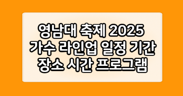 영남대 축제 2025 가수 라인업 일정 기간 장소 시간 프로그램을 알려 드리겠습니다. 이 문서를 읽어주시면 영남대 축제 2025 가수 라인업 일정 기간 장소 시간 프로그램을 이해하시게 될 겁니다. 영남대 축제 2025 가수 라인업 일정 기간 장소 시간 프로그램이 궁금하신 분들은 반드시 모두 읽어주세요. 이제 아래에서 영남대 축제 2025 가수 라인업 일정 기간 장소 시간 프로그램을 알아보도록 하겠습니다.