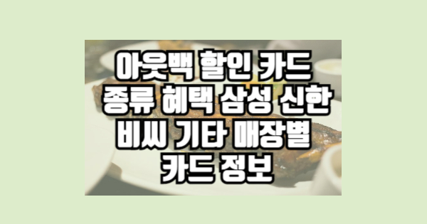 아웃백 할인 카드 종류 혜택 삼성 신한 비씨 기타 매장별 카드 정보를 전달해보았습니다. 어떻게 생각하시나요? 다른 것도 궁금하시다면 위의 글들을 참고하시면 도움이 될 것 같습니다.