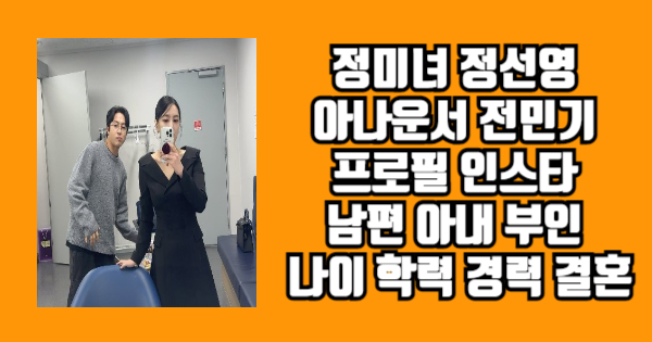 정미녀 정선영 아나운서 전민기 프로필 인스타 남편 아내 부인 나이 학력 경력 결혼에 대하여 소개해보도록 하겠습니다. 이 내용을 끝까지 읽으면 정미녀 정선영 아나운서 전민기 프로필 인스타 남편 아내 부인 나이 학력 경력 결혼을 알아두시는 것에 도움이 될 것입니다. 정미녀 정선영 아나운서 전민기 프로필 인스타 남편 아내 부인 나이 학력 경력 결혼이 궁금하시다면 반드시 모두 읽어주세요. 이제 아래에서 설명해드리겠습니다.