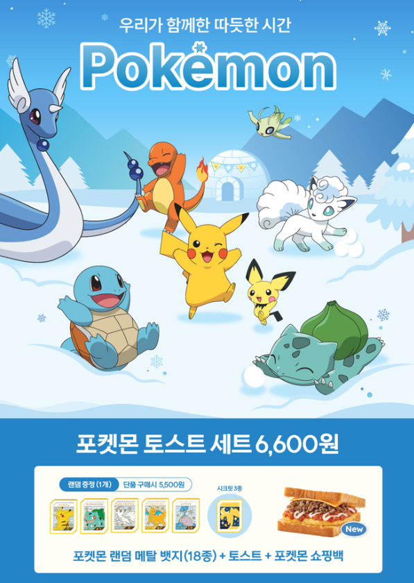 세트 구성: 신메뉴 토스트 7종 중 1가지 선택, 메탈 형식의 포켓몬 랜덤 뱃지 1종, 포켓몬 쇼핑백