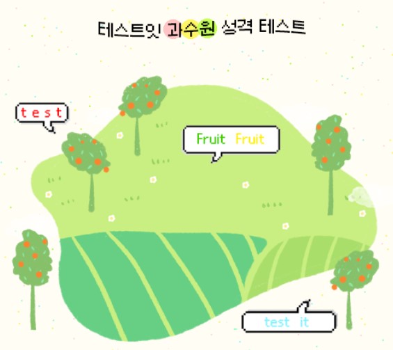 이렇게 테스트잇 과수원 성격 테스트를 통해 여러분의 성격을 재미있게 알아볼 수 있어요. 성격 테스트 결과는 해당 홈페이지에서 질문에 답을 하고 확인 하실 수 있습니다.