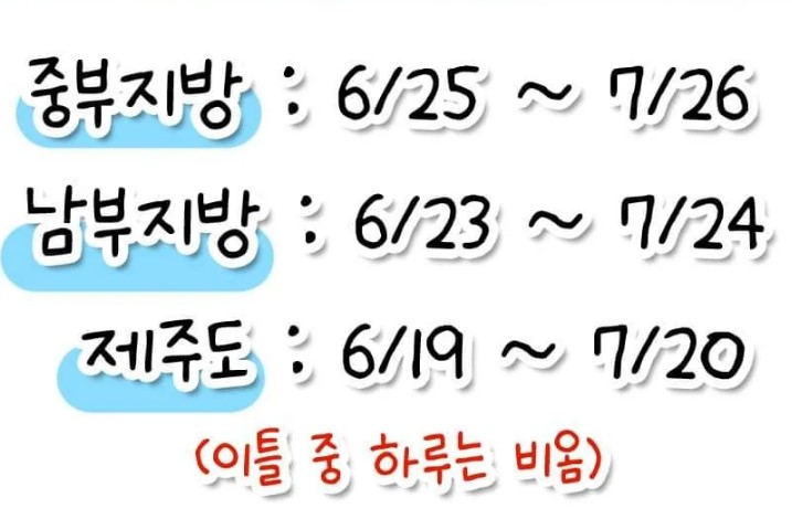 제주도의 경우 6월 19일부터 7월 20일까지 장마가 32.4일, 강수일수는 17.5일입니다. 제주도의 경우 중부와 남부지방보다 5일 정도 빠른 6월 말에 장마가 시작될 가능성이 높습니다.