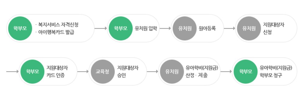 유치원에 입학할 원아가 유아학비를 지원받기 위해서는 유아의 유아학비(사회복지서비스 및 급여) 자격을 취득한 후, 유치원을 통해 유아학비 지원대상자 신청절차를 거쳐야 합니다.