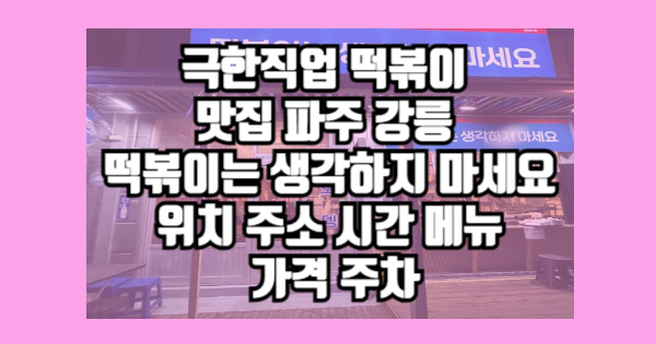 극한직업 떡볶이 맛집 파주 강릉 떡볶이는 생각하지 마세요 위치 주소 시간 메뉴 가격 주차를 전달해드리겠습니다. 이 내용을 모두 읽어주신 분들은 극한직업 떡볶이 맛집 파주 강릉 떡볶이는 생각하지 마세요 위치 주소 시간 메뉴 가격 주차를 이해할 겁니다. 극한직업 떡볶이 맛집 파주 강릉 떡볶이는 생각하지 마세요 위치 주소 시간 메뉴 가격 주차의 정보가 필요하다면 끝까지 읽어주세요. 아래에서 모두 공유해드리겠습니다.
