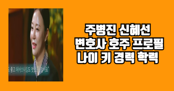 주병진 신혜선 변호사 호주 프로필 나이 키 경력 학력을 공유해보았습니다. 읽어보니 어떠신가요? 추가적으로 궁금하신 게 있다면 위의 글들을 참고하시면 도움이 될 것 같습니다.
