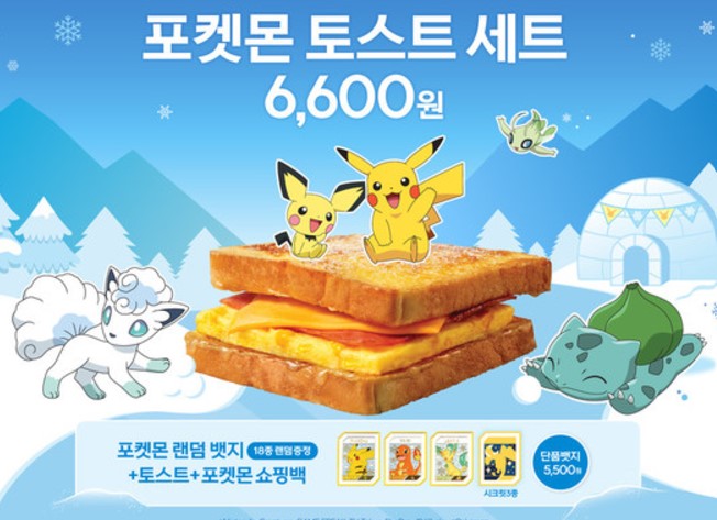 세트 구성: 신메뉴 토스트 7종 중 1가지 선택, 메탈 형식의 포켓몬 랜덤 뱃지 1종, 포켓몬 쇼핑백