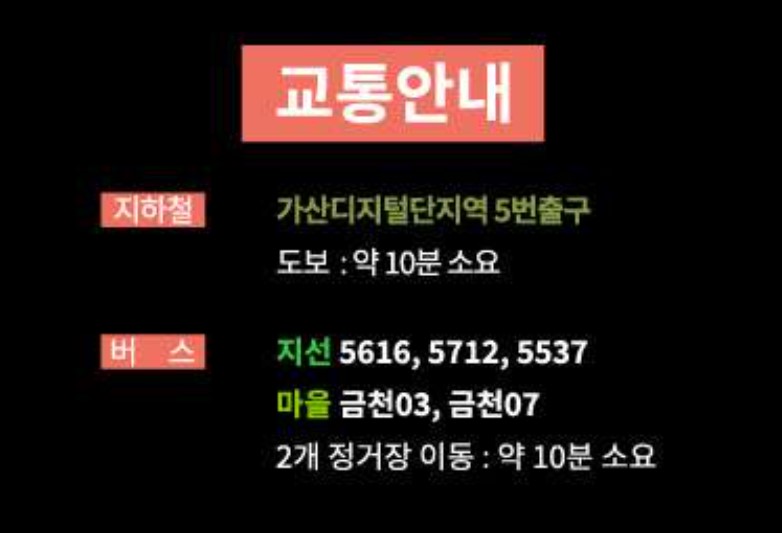 - 일반버스: 503, 504, 571, 652번을 타고 ‘가산디지털단지역’ 정류장에서 하차 후 도보 10분 거리입니다.