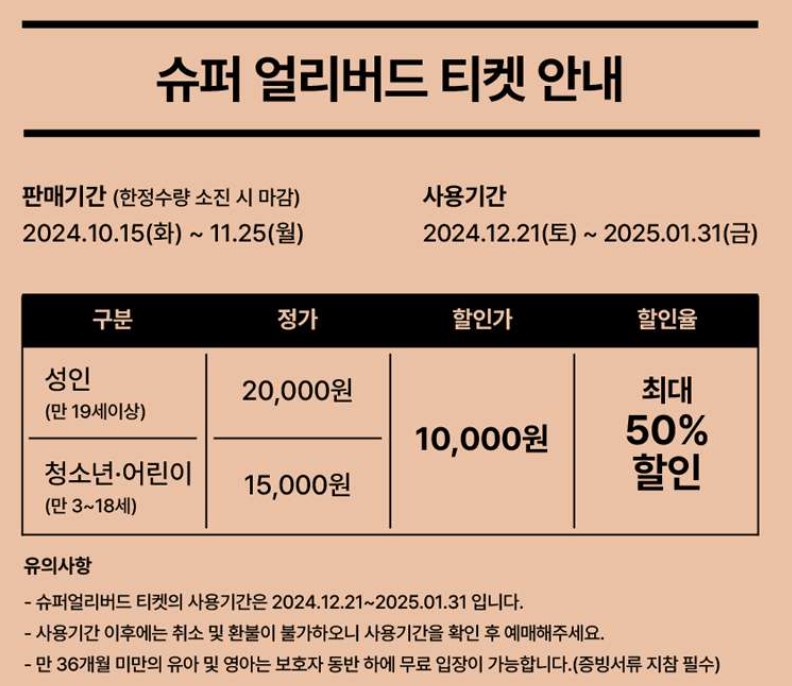 - 슈퍼 얼리버드 티켓 판매 기간: 2024년 10월 15일(화) ~ 11월 25일(월)