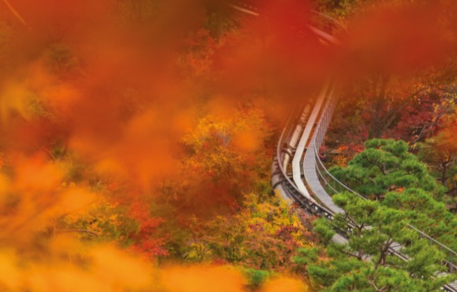 모노레일을 타고 숲을 둘러보며 단풍을 감상할 수 있습니다. 모노레일은 1승강장에서 출발하며, 코스별로 요금이 다릅니다.