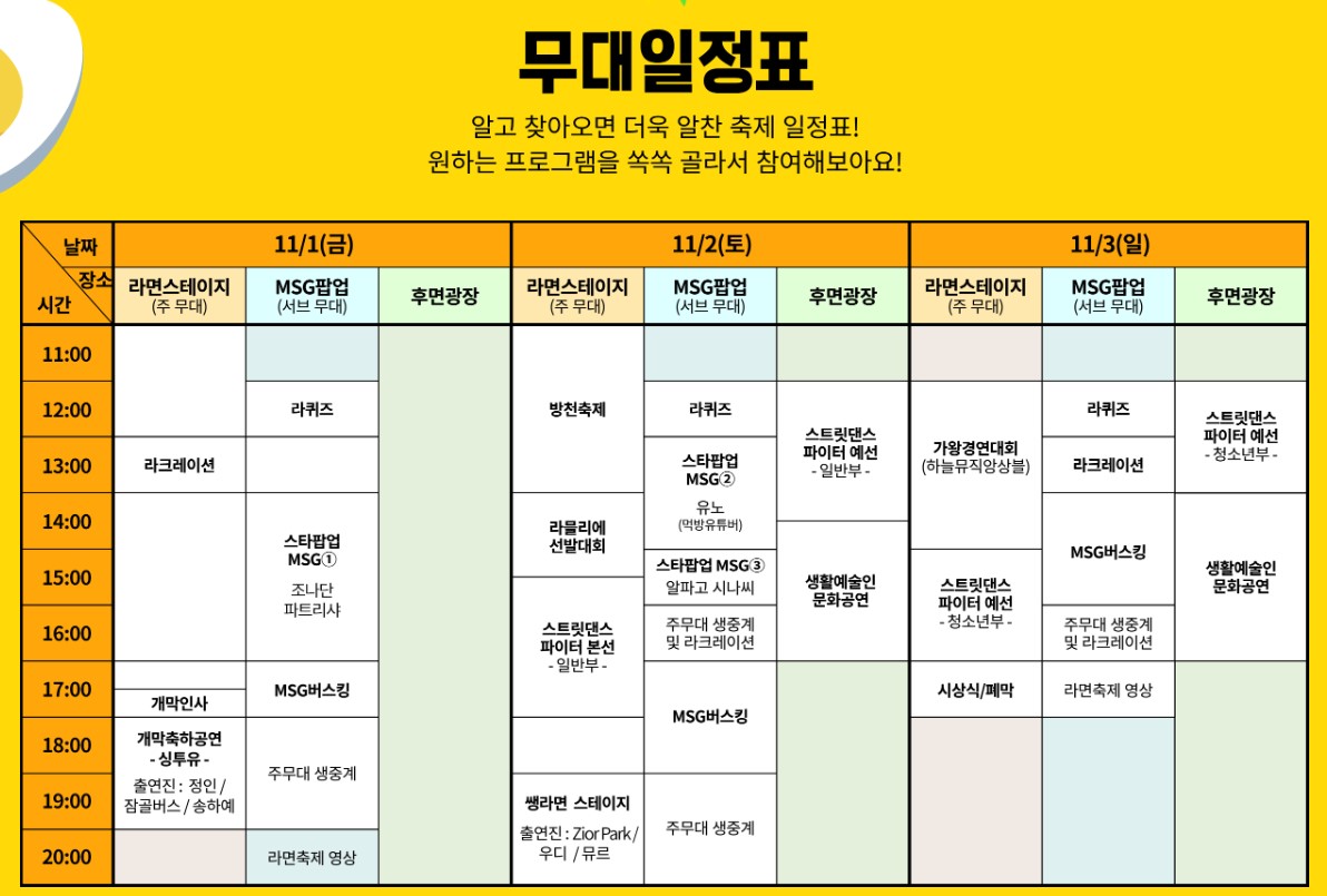 - 쌩(Live)라면 스테이지: 11월 2일(토) 19:00~21:00