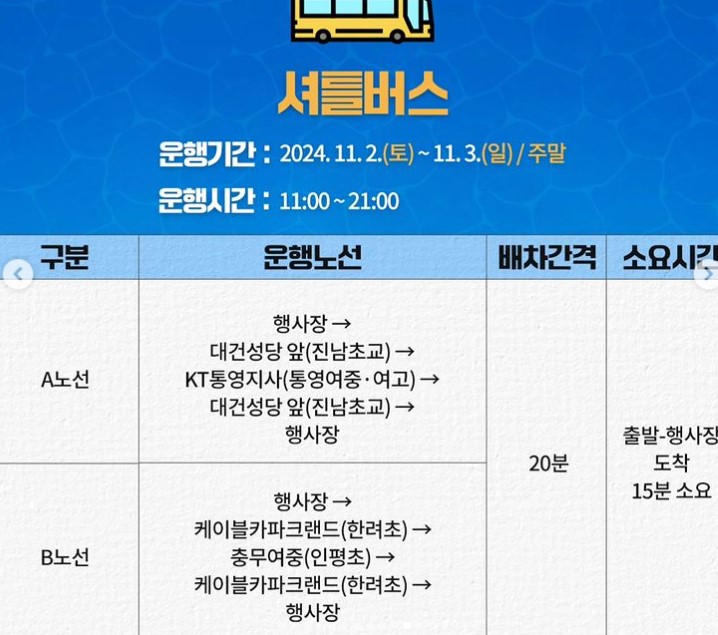 - 셔틀버스: 11월 2일(토) ~ 11월 3일(일) 오전 11시 ~ 오후 9시, 20분 간격으로 운행