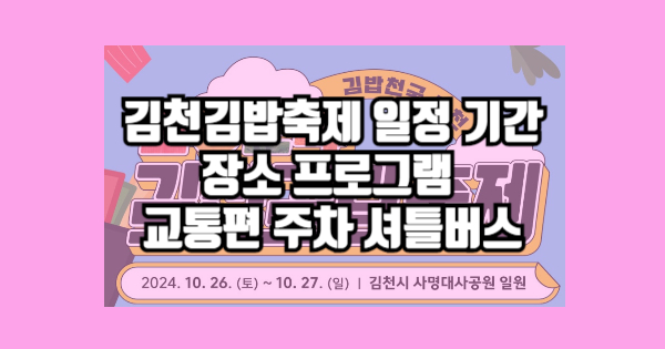 김천김밥축제 일정 기간 장소 프로그램 교통편 주차 셔틀버스를 알려 드리겠습니다. 이 문서를 끝까지 읽으면 김천김밥축제 일정 기간 장소 프로그램 교통편 주차 셔틀버스를 이해하게 되실 겁니다. 김천김밥축제 일정 기간 장소 프로그램 교통편 주차 셔틀버스가 궁금하다면 반드시 끝까지 읽어주세요. 이제 아래에서 전부 알려드리겠습니다.
