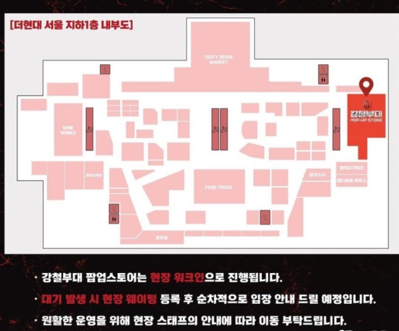강철 부대 팝업 예약은 온라인이 아닌 현장 워크인으로 진행 됩니다. 대기 발생시 현장 웨이팅 등록 후 순차적으로 입장 합니다.