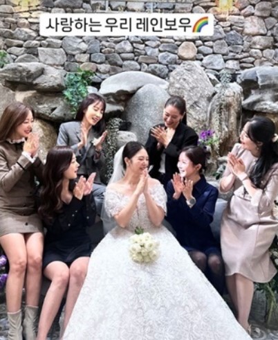 결혼식 현장은 축하객들의 따뜻한 마음으로 가득했습니다. 특히 레인보우 멤버들의 모습이 눈에 띄었는데요. 김재경, 고우리, 지숙, 노을, 오승아, 조현영 씨가 한자리에 모여 신부를 둘러싸고 축하를 전하는 모습이 정말 감동적이었습니다.