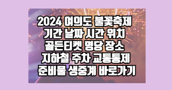 2024 여의도 불꽃축제 기간 날짜 시간 위치 골든티켓 명당 장소 지하철 주차 교통통제 준비물 생중계 바로가기 을 전달해보았습니다. 모두 다 읽어주셔서 감사합니다. 추가적으로 궁금하신 게 있다면 위의 글들을 참고하시면 도움이 될 것입니다.